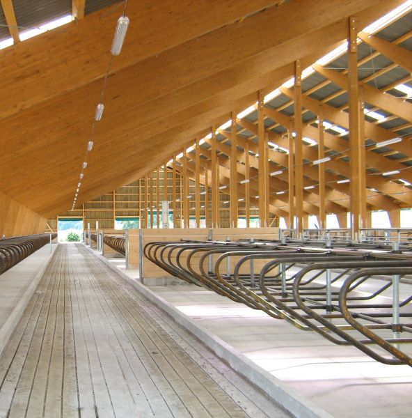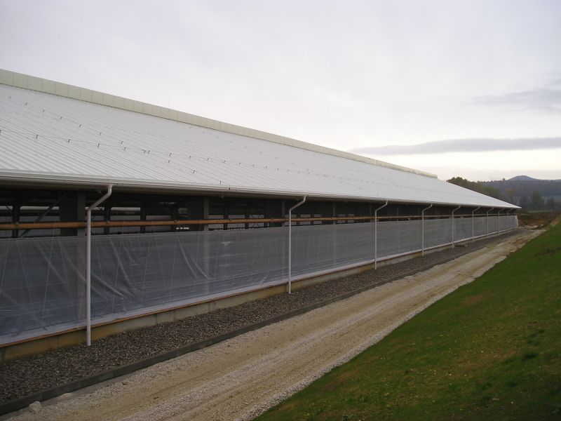 tato stavba byla postavena na místě původní tzv. stáje Fidlot. Navrhli jsme zde, v posledních letech, velmi oblíbenou variantu nosné konstrukce složené z lepených dřevěných vazníků s nosnými ocelovými podpěrnými sloupy. Opláštění tvoří betonové panely a 2 m větrací plachty. Ustájení dobytka je navrženo v individuálních kotcích.